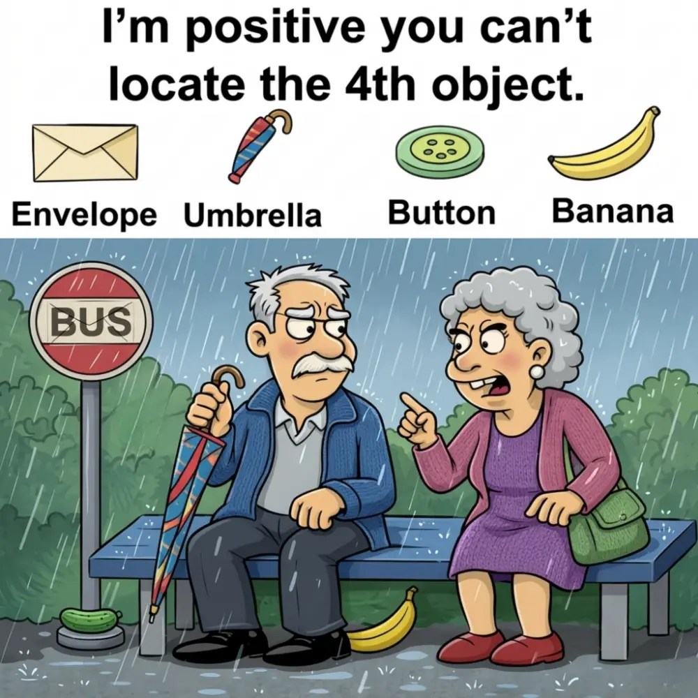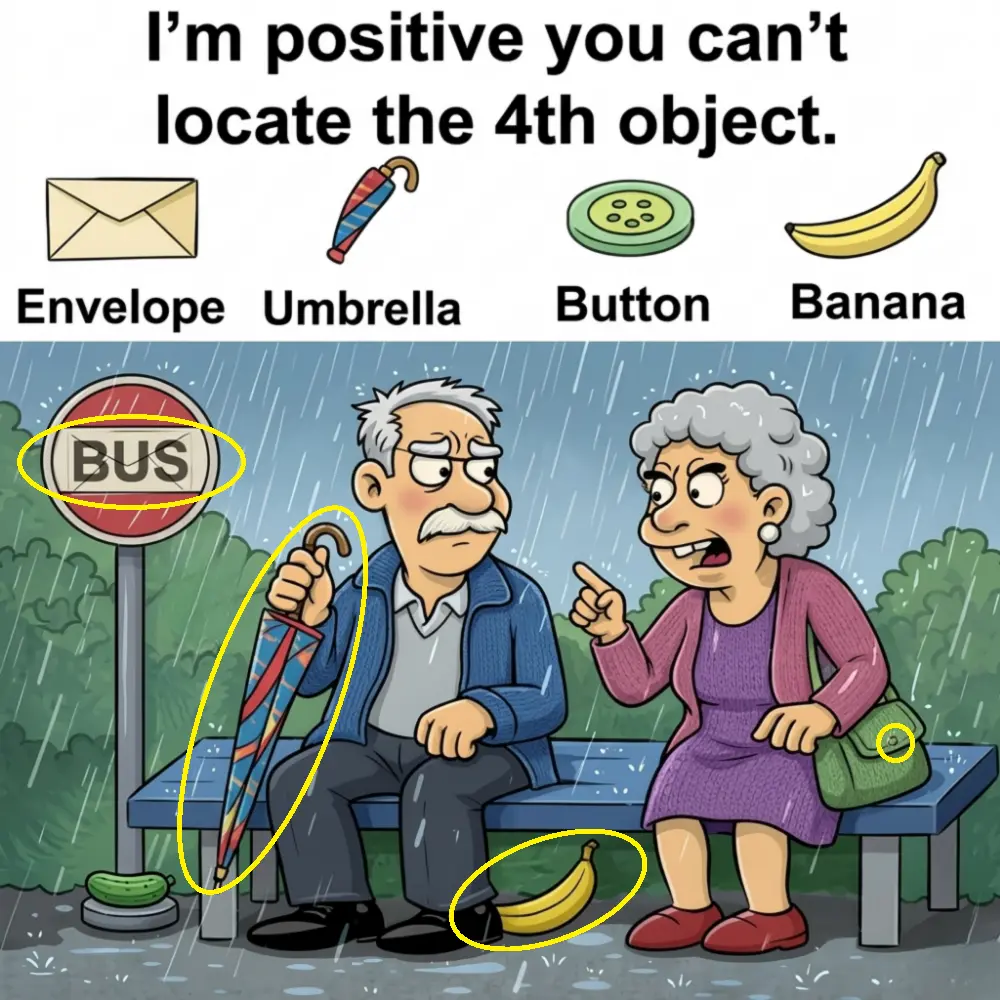 Hidden object puzzles are fun because they turn an ordinary scene into a visual challenge. In this image, we see two older people sitting at a rainy bus stop, but hidden inside the illustration are four objects: an envelope, an umbrella, a button, and a banana.