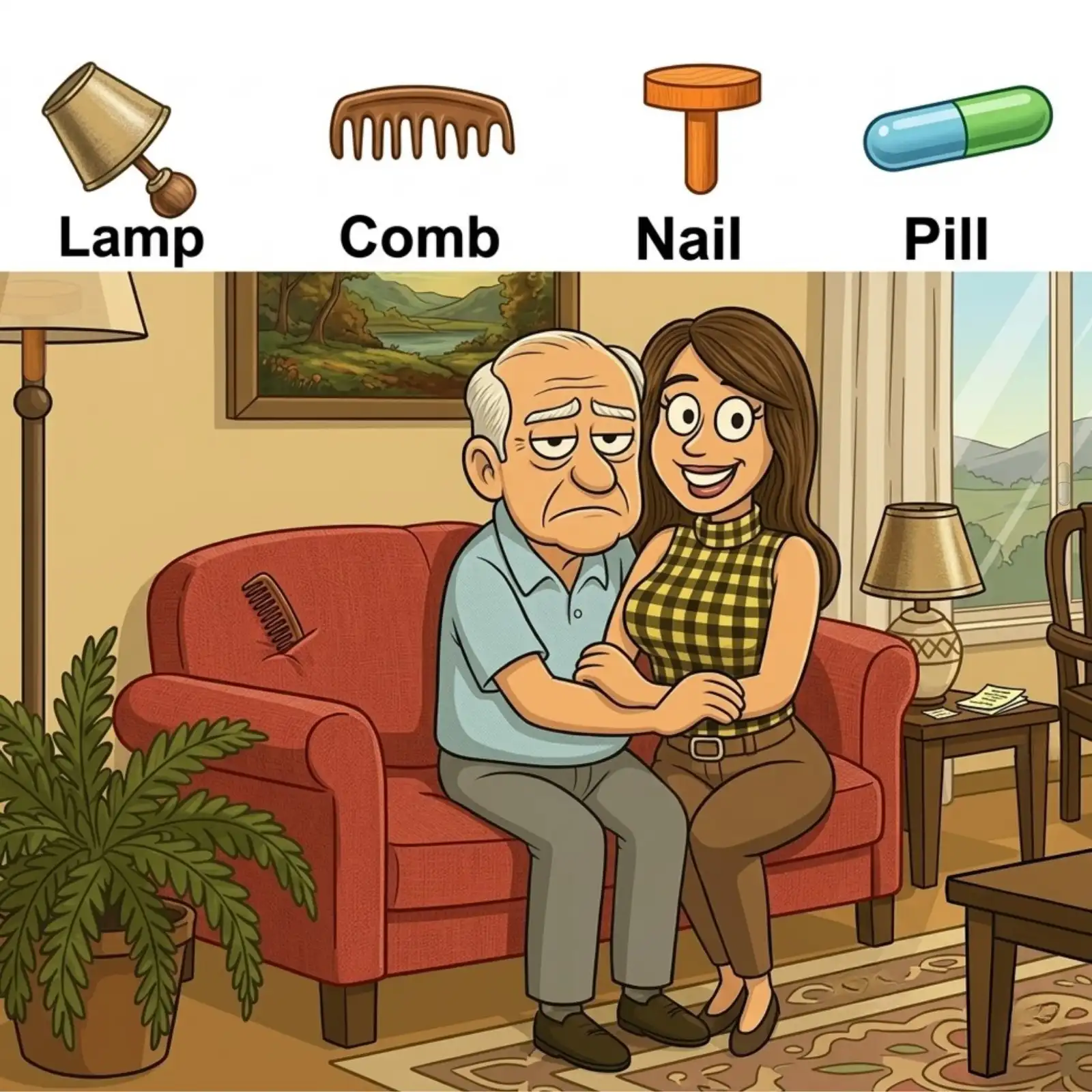 Hidden object puzzles have a way of turning an ordinary scene into a fun visual challenge. At first glance, this image looks like a simple living room illustration with two people sitting on a couch. But once you look more closely, you realize there’s much more going on. Somewhere in the picture, four objects are cleverly hidden: a lamp, a comb, a nail, and a pill.