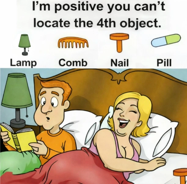 Somewhere in this scene are four objects: a lamp, a comb, a nail, and a pill. The question is—can you find them all?